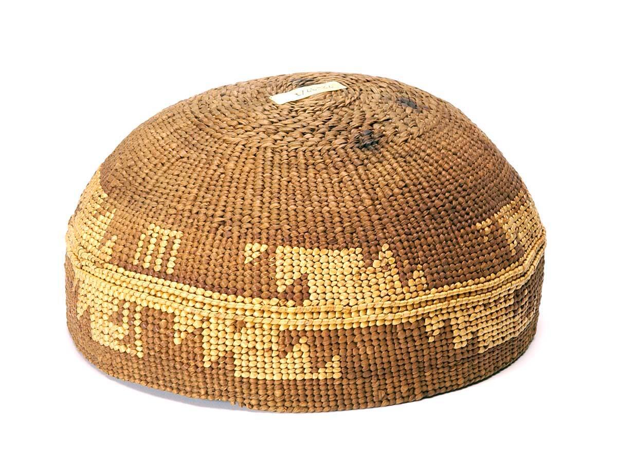 DescriptionBowl-like hat with buff-colored pattern on brown body; two bands of raised reeding around middle. repeated over hat.