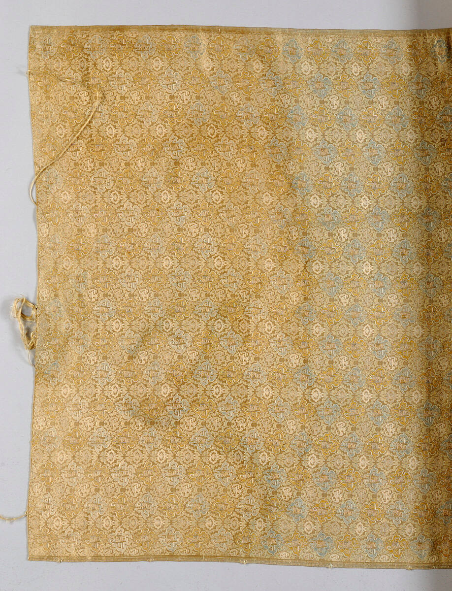 DescriptionAll-over pattern of archaic dragons in tan, brown and blue on tan satin ground. Part cut off to upholster two Duncan Phyfe chairs.