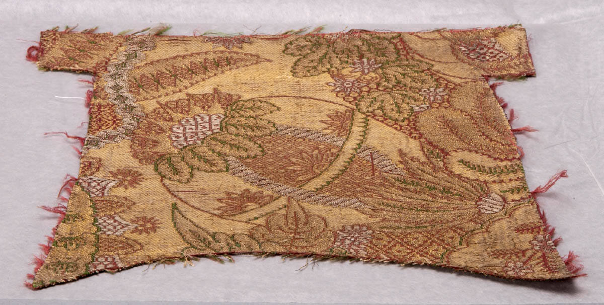DescriptionDelicate, highly conventionalized floral design in green, brown, and silver lines on a gold background.