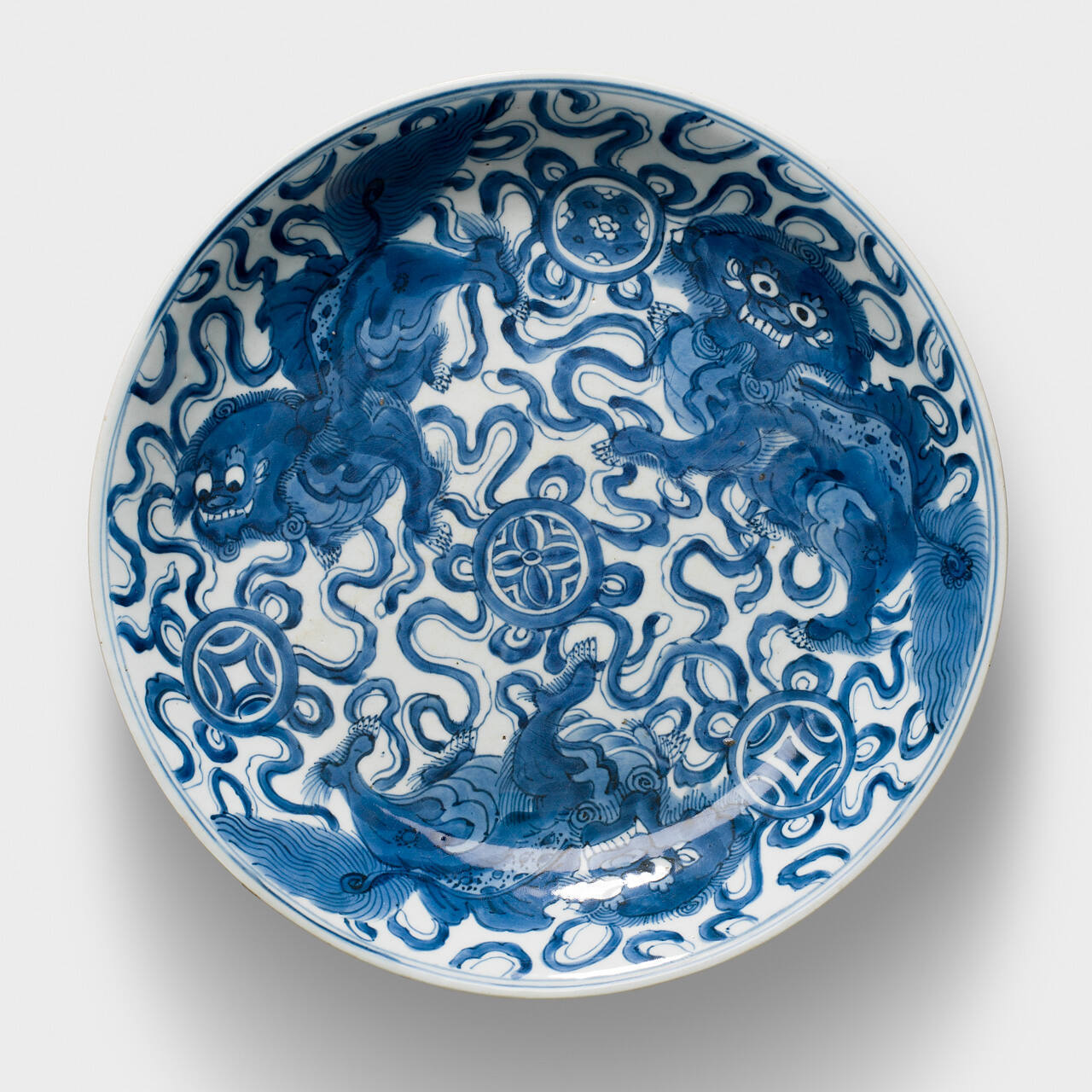 DescriptionLarge blue on white plate with a design of three chimera and serpentine ribbon all-over patternProvenanceWith T’ien Lien Kun, Peiping (modern-day Beijing), China, by March 15, 1934;