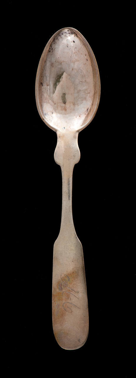 DescriptionLarge silver serving spoon. Fiddle pattern. Engraved with initials in script D.M.A.