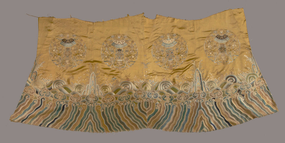 DescriptionFour circular medallions and wave pattern embroidered in polychrome colors on a gold ground.
