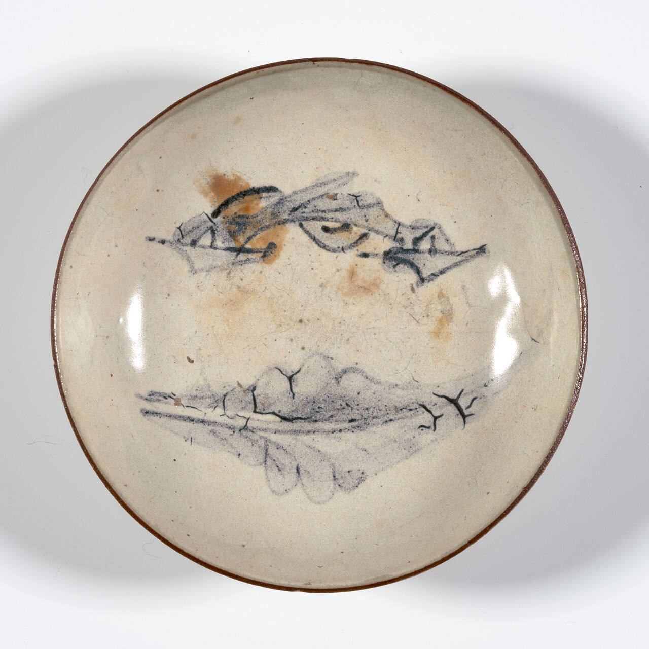 DescriptionPlate with a pale blue glaze, two dark blue leaves painted on the inside; with a box.