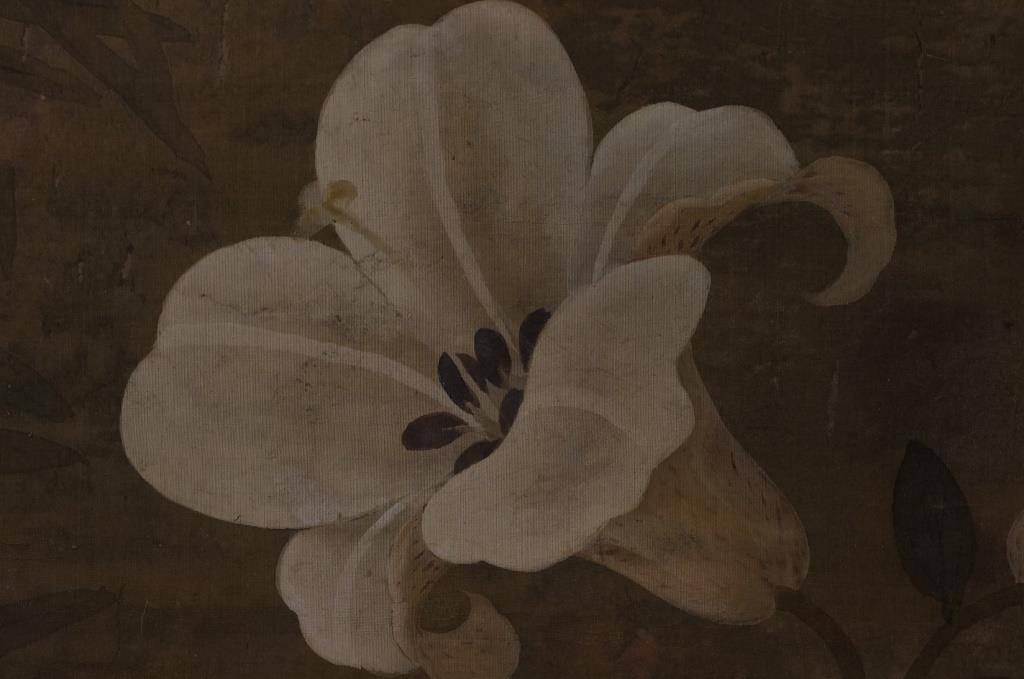 DescriptionMallow flower, large white lily, and verbena. One of a set of twelve hanging scrolls representing flowers of all seasons.