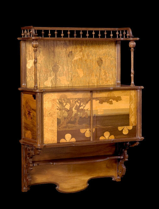DescriptionHanging cabinet divided into three sections, middle section comprised of enclosed cabinet with doors, doors inlaid with sunset scene surrounded by inlaid panels depicting poppies and other flowers. Bottom third of object comprised of shelf supported by pierced brackets carved to depict poppies. Top third backed by panel inlaid with poppy motif.Gallery LabelA short walk into the gardens of his home provided Emile Gallé with ample inspiration for the botanical decorations displayed in this cabinet's landscape scene and the entwined, carved poppies that form the brackets. Gallé's glass and furniture workshops in the eastern French city of Nancy produced innovative designs based on nature and Japanese design principles, both important characteristics of the Art Nouveau style. Here, various grains and hues of wood veneers (marquetry) combine to create a scene of a setting sun framed by trees. This landscape is balanced by asymmetrical patterns of simplified floral motifs in the Japanese tradition.