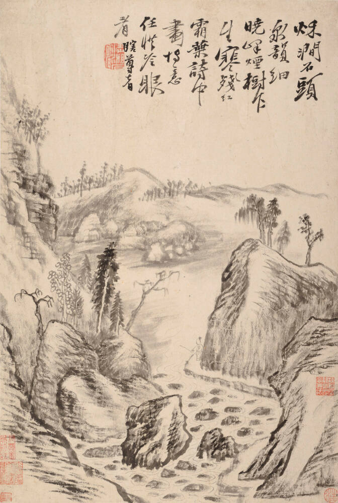 DescriptionWinding river in a mountain pass; figure walking near shore.Gallery LabelA descendant of the Ming imperial line, Shitao feared persecution from the newly established Qing Dynasty (1644–1911) and took refuge in the Buddhist monastic order for much of his life. These two leaves reveal his broad stylistic range and his intensely poetic sensibility: Walking on a Cold Morning exudes a naïve, childlike quality. The figure walking along the path is undoubtedly the artist himself, whom he describes in his inscription as the Venerable Blind Man,” possibly a reference to his deteriorating eyesight in his old age.