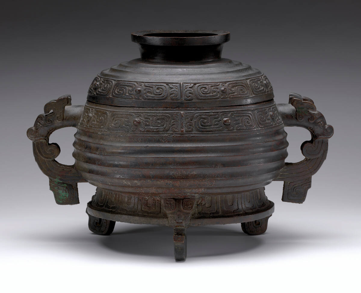 DescriptionBronze vessel with three low feet in the form of claws, supporting a concave base, with two loop handles in the form of bovine animal heads. The body of the vessel is decorated with six bands of horizontal fluting and one band at the top of low relief simplified kuei dragons and t'ao-t'ieh masks. The lid is on a low foot, with a similar design, made to be reversed for use as a bowl.