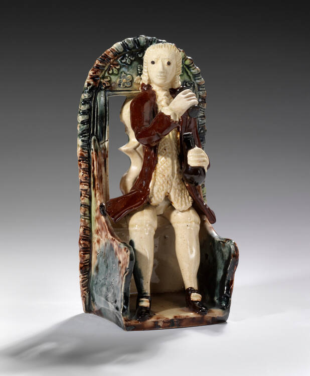 Gallery LabelFigures of men and women in everyday pursuits were popular in 18th-century England. Made with molds, these forms could be reproduced at a reasonable cost. Here, a seated man enjoys a drink of wine from the bottle in his left hand.