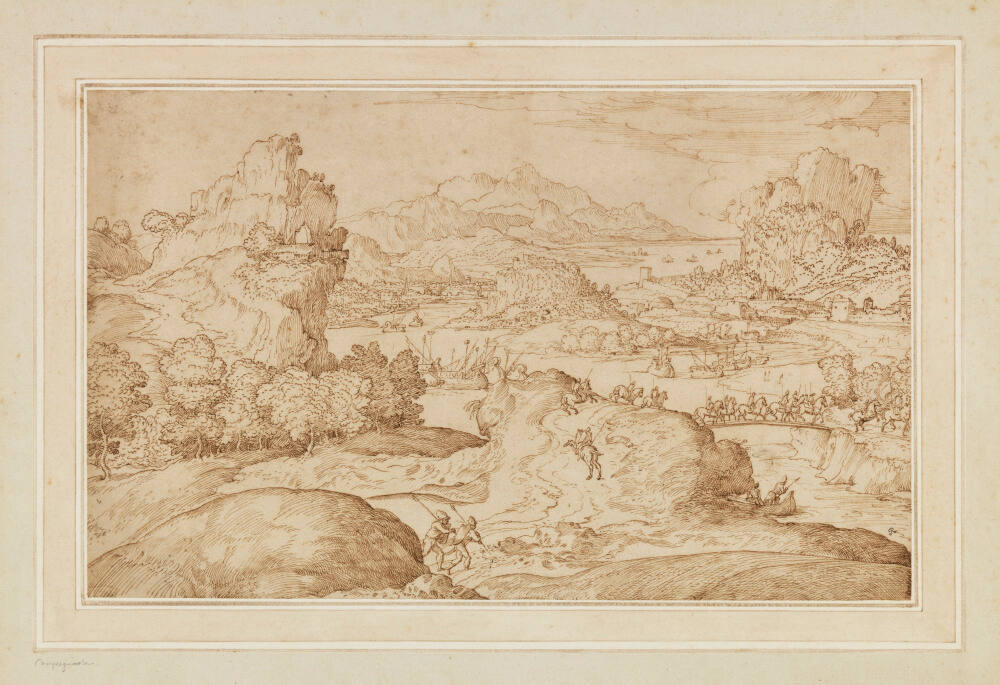 The artist was a follower of Titian, the author of the landscape engraved by Cornelis Cort exhibited nearby, and the rolling landscape is very similar to the one in Cort’s print. In this drawing, man’s activities are everywhere apparent, but nature still dominates and keeps man in his place.