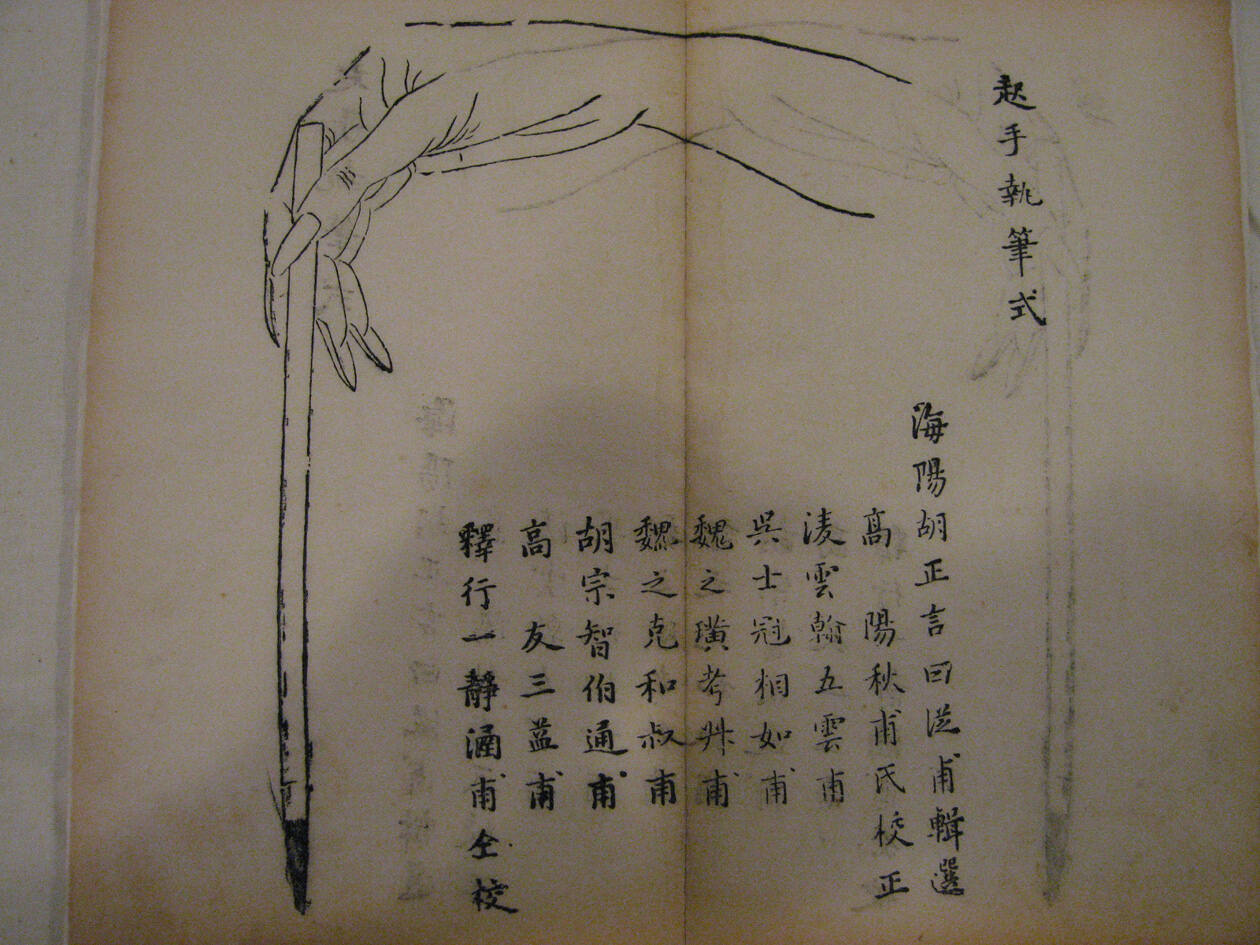 Gallery LabelBoth printed manuals provided an affordable resource for students aspiring to learn the styles of early master painters. The Ten Bamboo Studio gives simple instructions on handling a brush to create images, such as the types of grass displayed in the second print. Published 50 years later, The Mustard Seed Garden includes many volumes dedicated to the instruction of painting. The first volume covers the use of painting tools and materials: brushes, ink and pigments. The next several volumes explain the type of images such as trees, rocks, birds, flowers and figures, through either samples by early masters or step-by-step instruction.