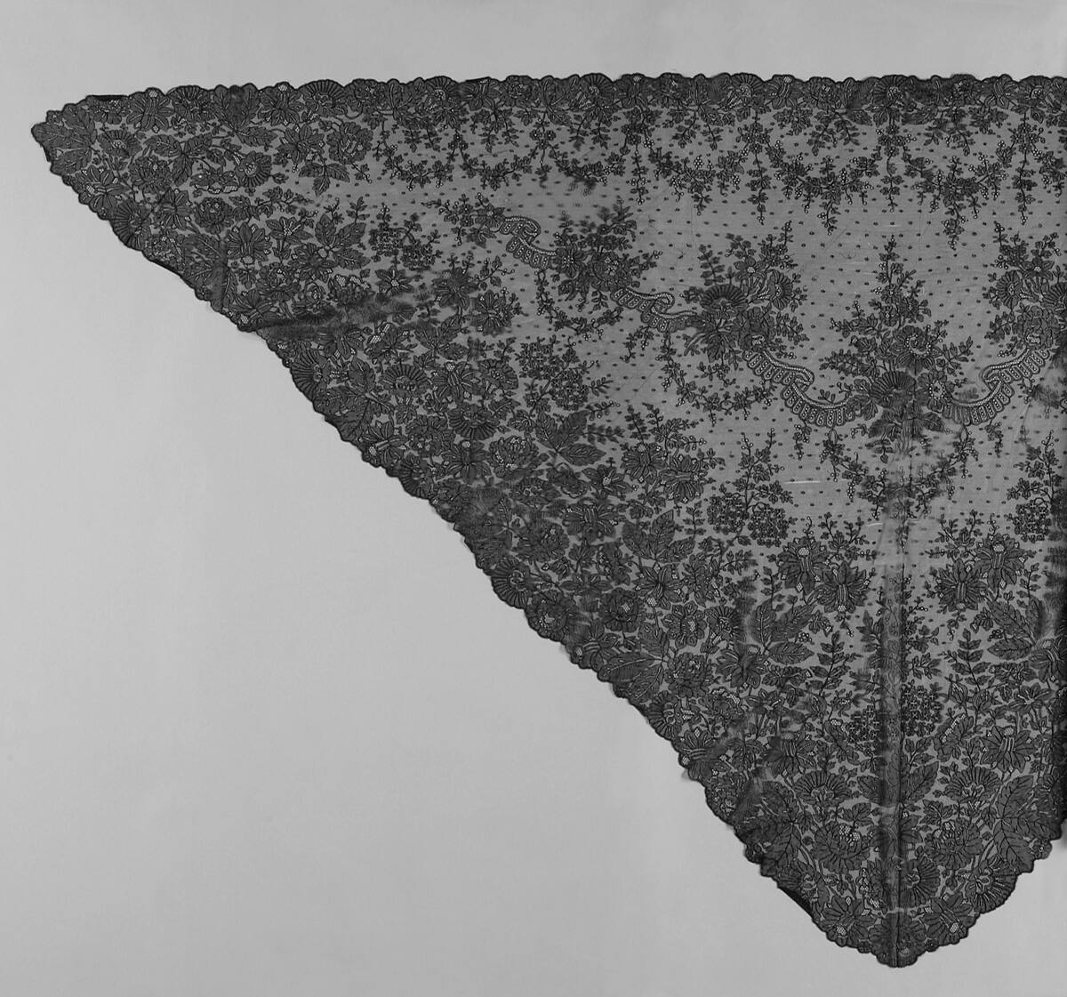 DescriptionTriangular lace shawl, black. All-over floral pattern.
