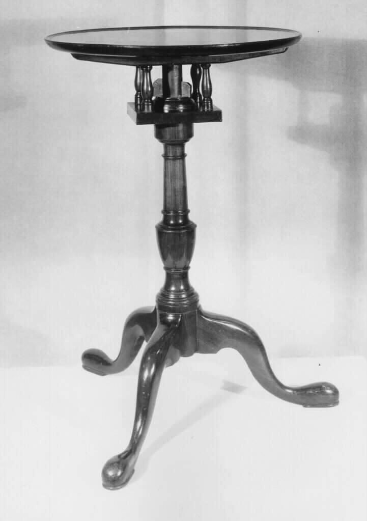 DescriptionThe stand rises from three snake feet which are blind dovetailed to the shaft and reinforced with the original iron spider. The shaft has an urn-shaped base supporting a ring-turned column. Two cleats are screwed to the round, lipped top. The cleats are hinged to a box ("birdcage") which fits over the top of the shaft. The box is held in place by a collar and a wedge fitted through slots in the collar and a mortise in the shaft. Four small turned balusters (one insered upside down) join the top and bottom of the box. The original brass spring latch is screwed to the underside of the top.