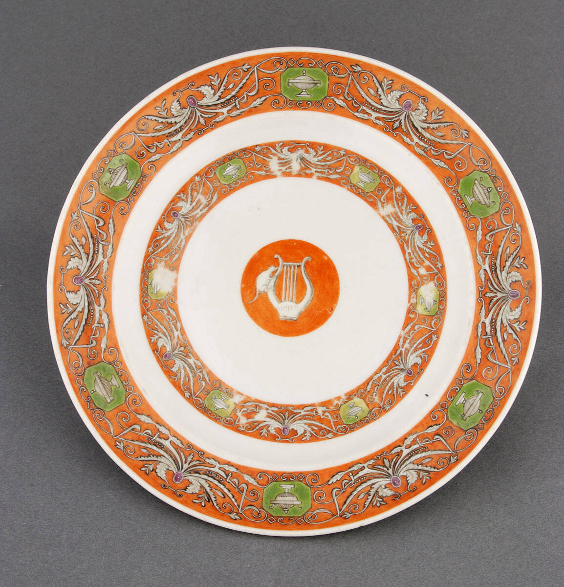 DescriptionPlate, same double border tomato red and light green as 55-3/190, with center medallion enclosing lyre with animal.