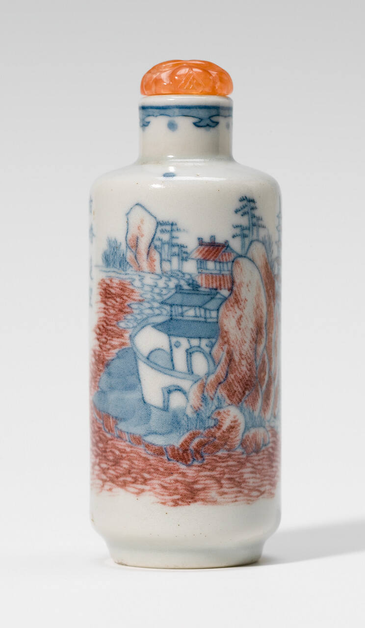 DescriptionCylindrical shape with blue, white, and iron red glaze, decorated with pagoda, pavilion, mountain and boat scene with extensive colophons describing scene. Carved amber stopper.