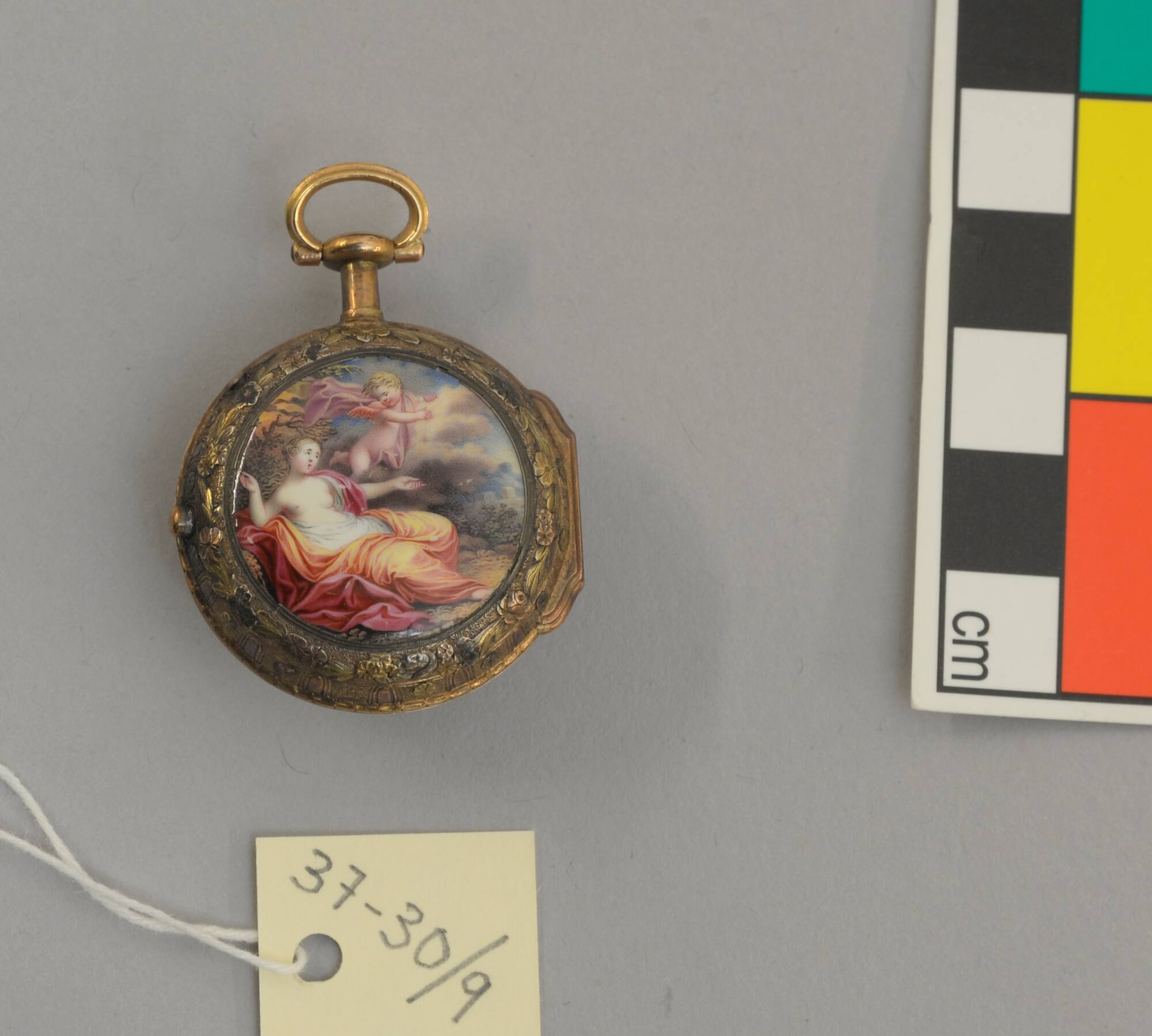 DescriptionWatch with hinged gold case having floral border on back of various colors of gold with silver. Circular medallion of seated semi-nude female figure with putti in sky. Rounded crystal, white face with Roman numerals, DM inside case.