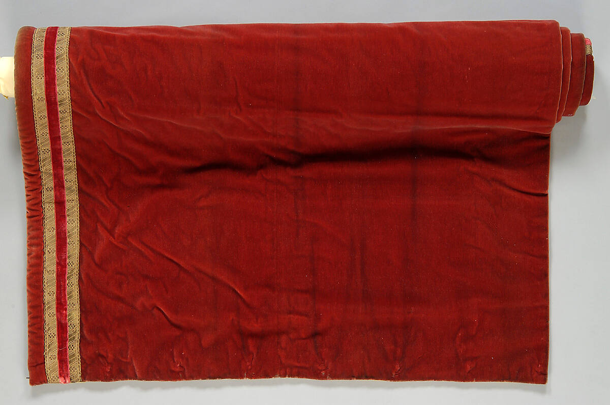 DescriptionTwo pair old rose velvet window hangings. Trimmed with gold braid, lined and innerlined.ProvenanceProbably William Rockhill Nelson (1841-1915), Oak Hall, Kansas City, MO, by 1915 [1];