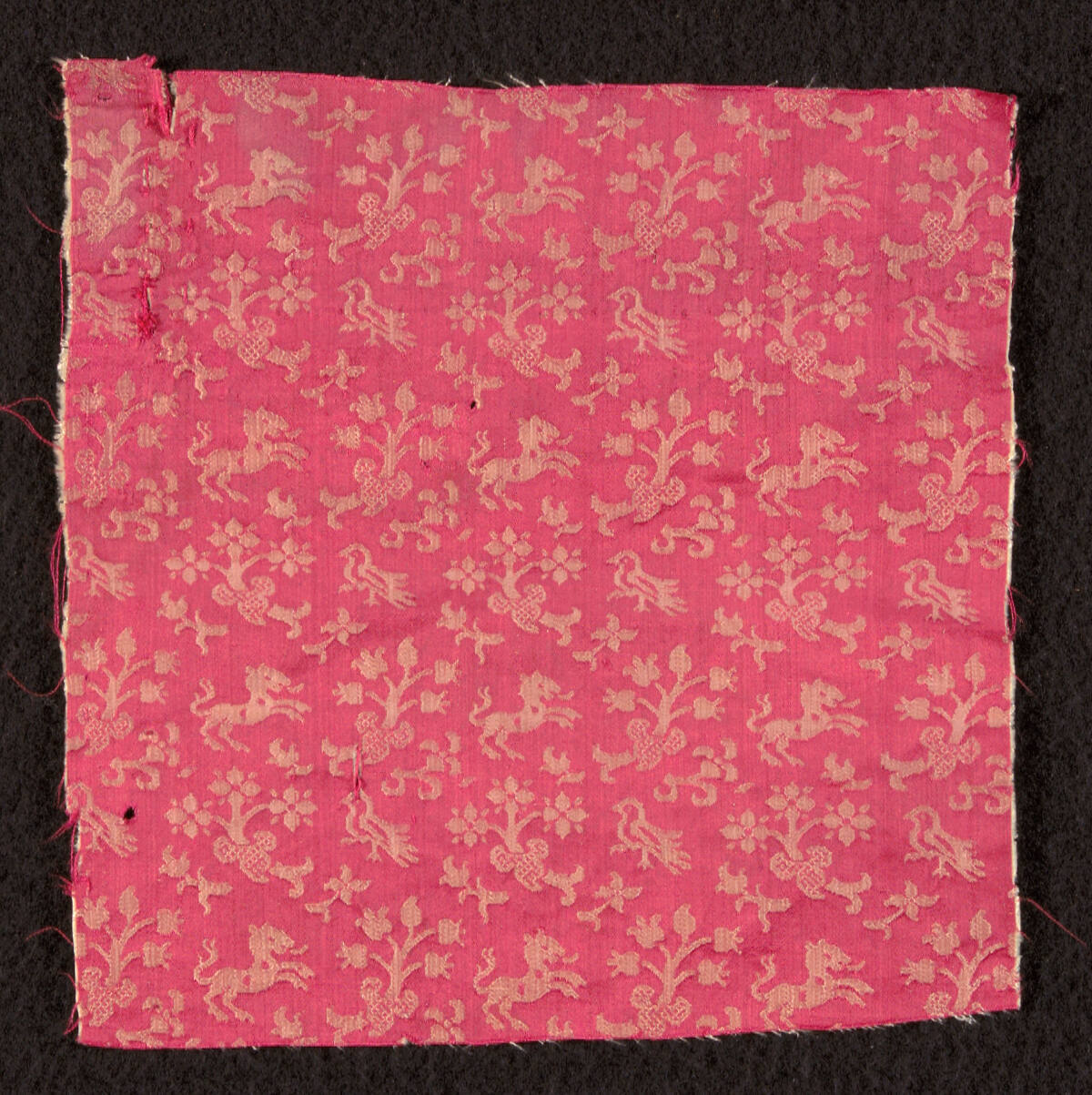 DescriptionTwo-color (red and white) damask, staing and tabby weave