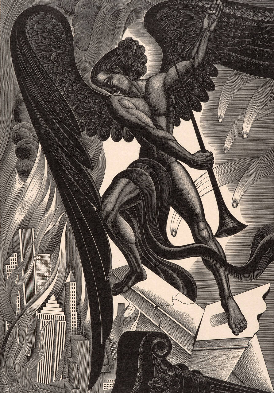 A grim international situation and the biblical Book of Revelations influenced the artist as he imagined this dramatic subject. Boris Artzybasheff, a native-born Russian, lived through the Russian Revolution and World War I before immigrating to the United States. In 1937, the year he made this engraving, America still suffered the effects of the Great Depression, while the unsettled atmosphere in Europe would lead to World War II in just two years’ time.