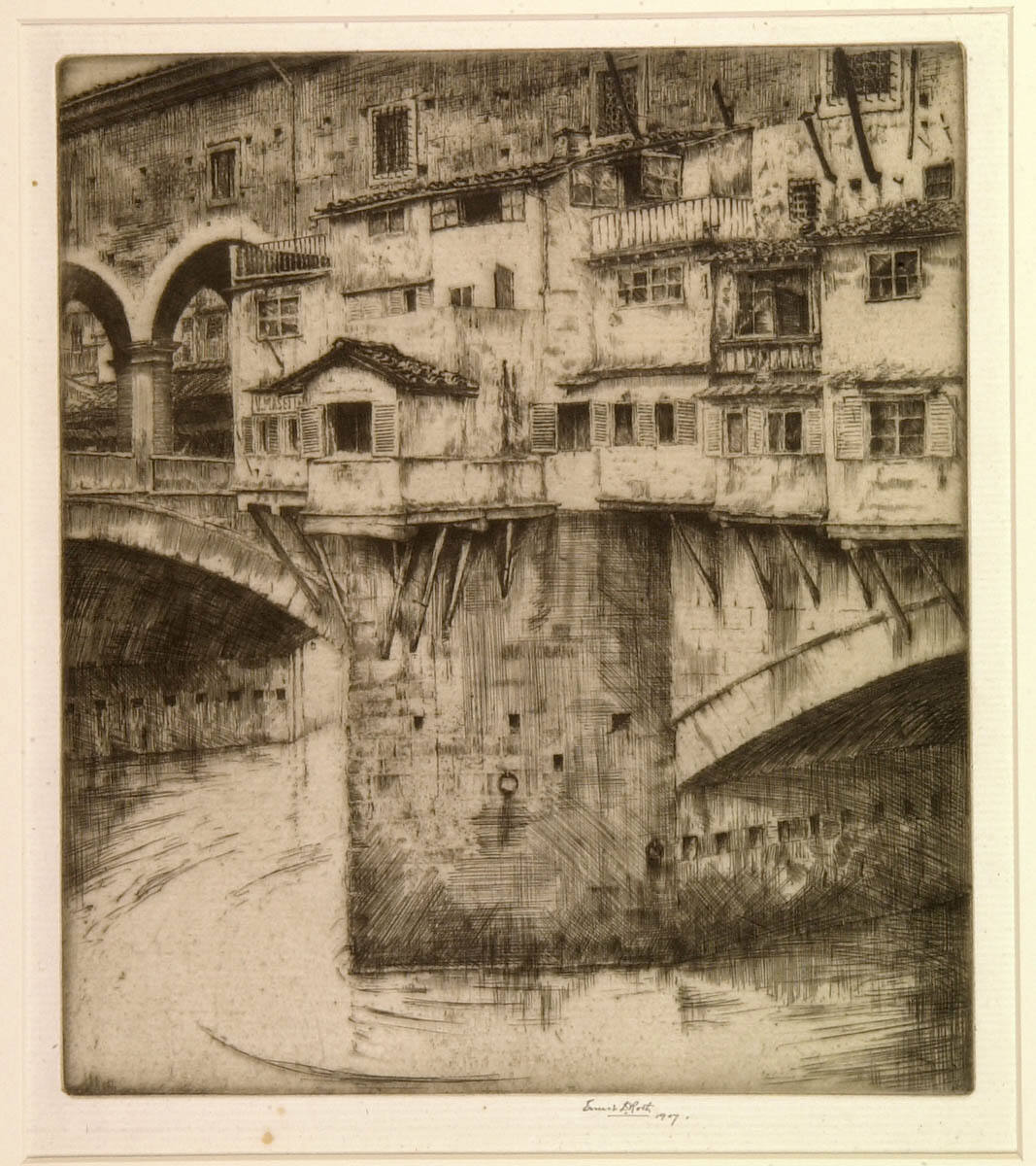 Gallery LabelItalian views were a favorite of the etching revivalists, as in this example of the famous medieval bridge in Florence. The close-up view omits any surrounding context and forces us to concentrate on the pattern of solids and voids, walls and windows. Notice the bold strokes on the buttress and on the arch, which convey a sense of strength.