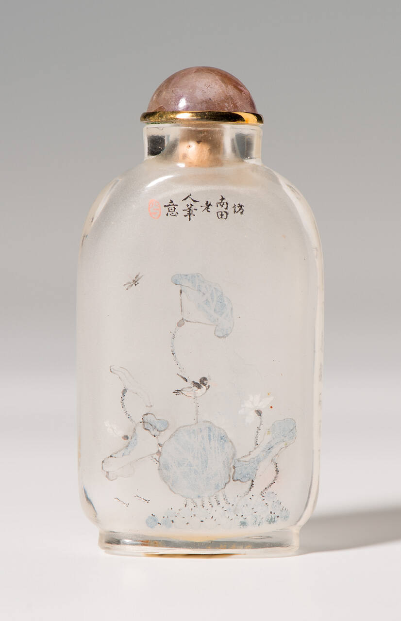 DescriptionRectangular-shaped Peking glass bottle inside painted with a lotus flower in a blue and white color with a bird and dragonfly in flight on one side and on reverse with extensive calligraphy; metal collar and amethyst stopper.
