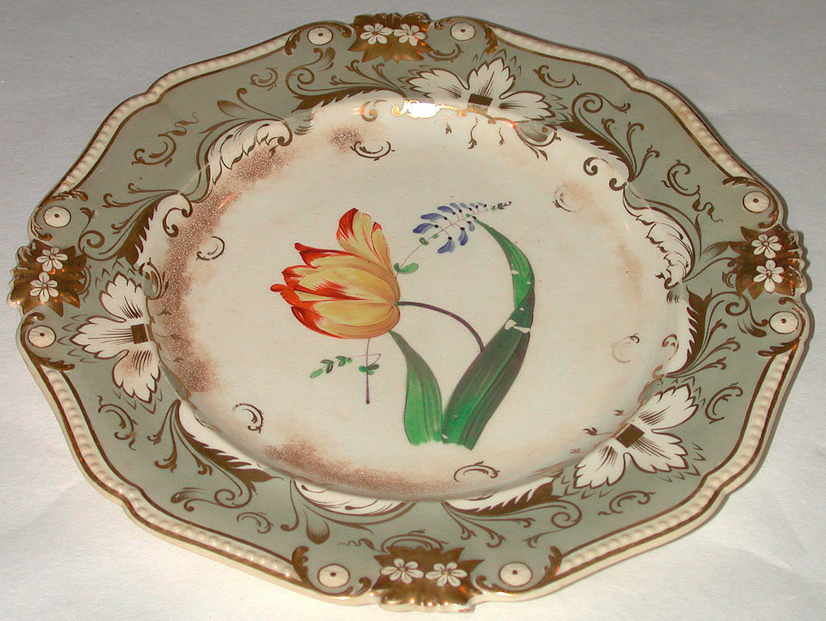DescriptionA cream colored plate with gray border decorated with gilt flower and leaf design. In the center is a spray of flowers enameled in several colors.ProvenanceWith Boswell & Ward, London, by September 9, 1932 [1];