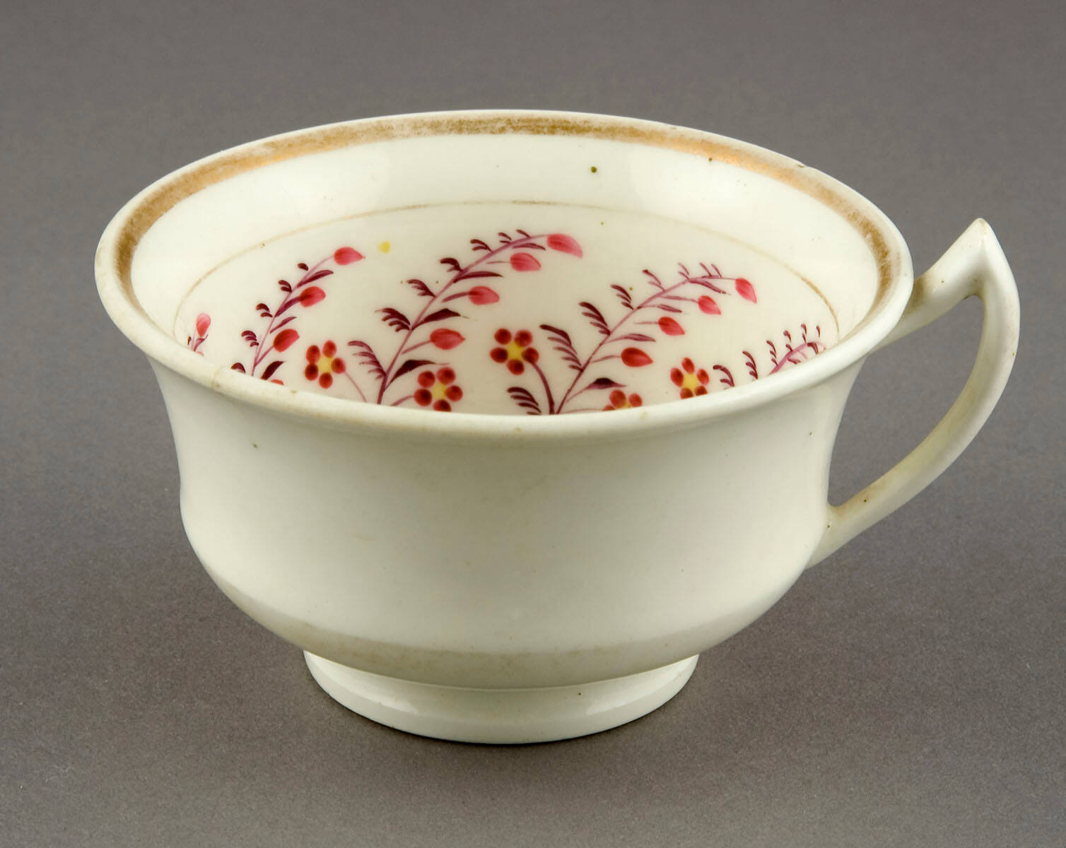 DescriptionDesign of purple stemmed, red petaled and green leafed spray on white ground with gold band border; nine sprays on inside of cup (faded) and saucer; 12 on inside of plate; number 1244 on bottom of plate.