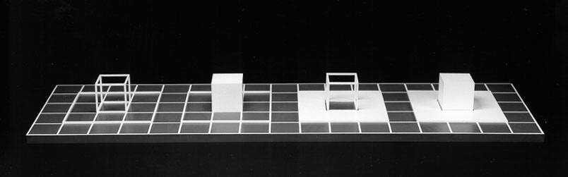 DescriptionFour white cube units, two of open frame construction and two with solid frame, are set in a "row" configuration on a flat, gridded base. The grey base has a white grid pattern.Copyright© The LeWitt Estate / Artists Rights Society (ARS), New York