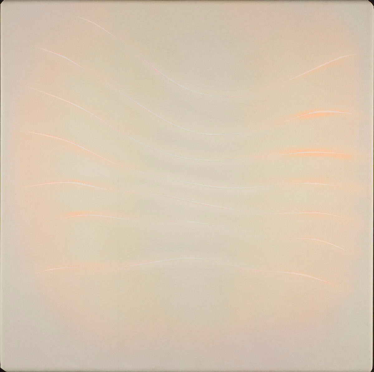 DescriptionSeries of seven undulating lines in white paint running horizontally across the canvas. Soft pinkish-orange mist surrounds each line and spreads out over lower edge and sides of canvas.Copyright© Estate of Ralph Humphrey