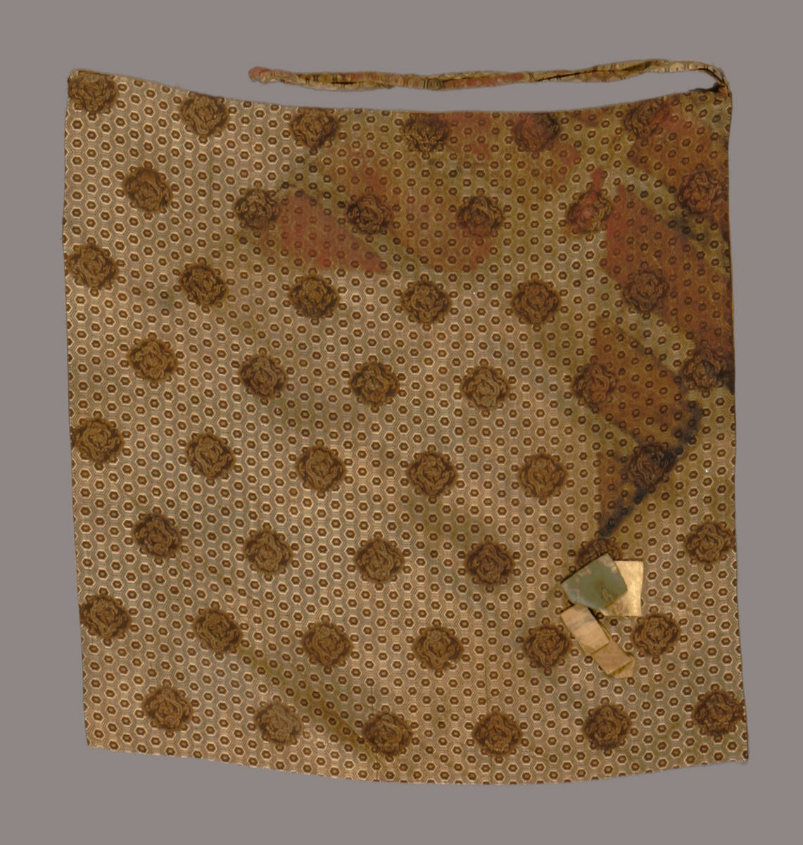 DescriptionSquare of brocade with all-over tortoise-back pattern and small cartouche containing dragons. Green and brown with gold thread, and silk lining. Cord attached to one corner.