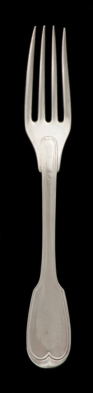 DescriptionHandle is in a fiddle-pattern, back of handle engraved with coat-of-arms consisting of fleur-de-lis, wreath, crown above and croix below.