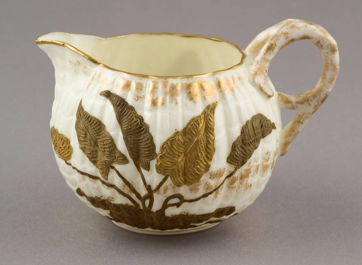 DescriptionDecorated with lily pads, butterflies, and dragonflies on a cream ground executed in raised gold, bronze and silver.