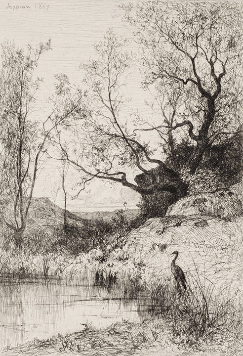 This print captures the peaceful isolation of a remote, pastoral landscape.The image is animated by a lone heron and distinguished by the intricate,tracery-like silhouettes of the bare, wintry trees. Adolphe Appian traveledextensively throughout France including in the mountainous region of thesoutheast, east of Lyon. Appian was a prominent member of the BarbizonSchool of landscape painters, and painted en plein air with Jean-Baptiste-Camille Corot (1796-1875).