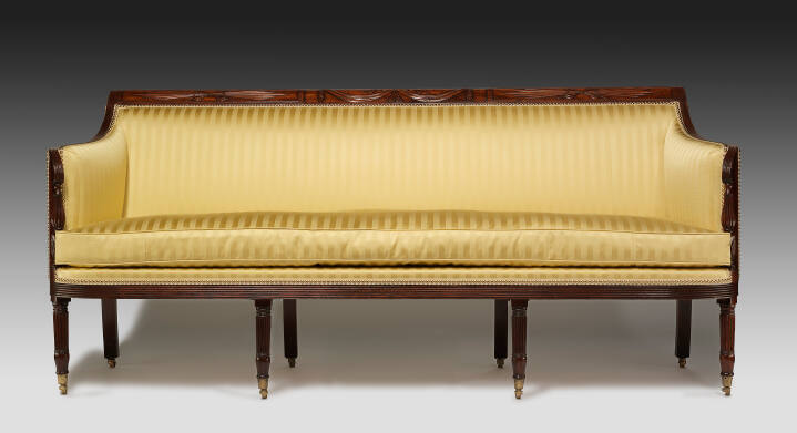 This sofa's elegant lines and restrained carving are typical of the best early-19th-century Neoclassical furniture produced along the eastern seaboard. During this period, New York replaced Philadelphia as the preeminent American center of furniture production. The sofa's detailed construction, refined carving and sophisticated design indicate that it was manufactured by an accomplished furniture maker, probably the renowned New York cabinetmaker, Duncan Phyfe, or one of his competitors. Born in Scotland, Phyfe popularized Neoclassical furniture in America. Here, swagged drapery and tassels, flanked by beribboned lightening bolts, decorate the sofa's top rail. Composed mainly of linear elements, the frame is softened by the graceful bow of the arms, which curve inwards.
