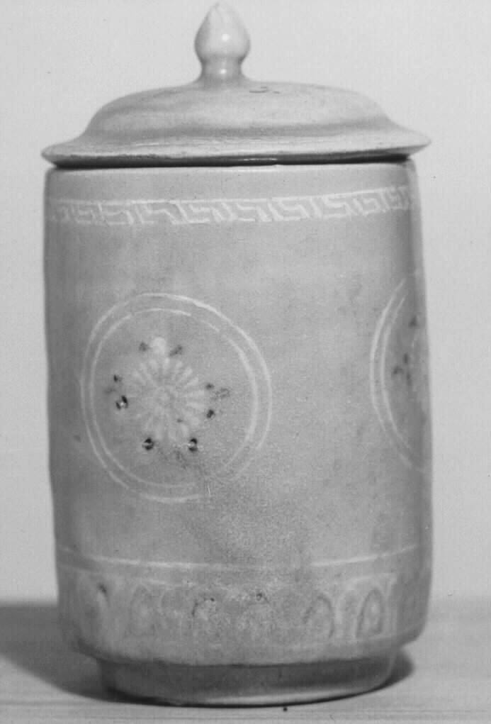 DescriptionCylindrical cup with stylized chrysanthemum decor. Light gray stoneware with decoration inlaid with black and white slip under celadon glaze.