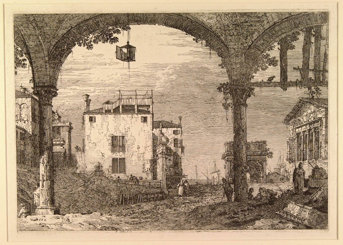 Gallery LabelThis view through a portico (or porch) does not depict an actual site in Venice but exists only in the artist’s imagination. One of a series of 33 prints, it combines domestic architecture with ancient Roman ruins in an effort to convey the romance of the city. The modest house framed by the center arch features a rooftop terrace used for drying clothing. On the right, a classical temple with its row of columns provides a striking contrast.