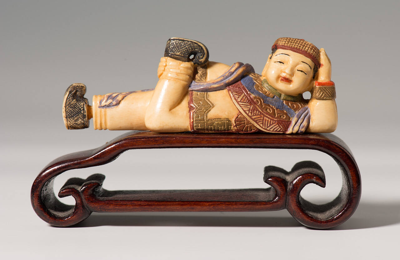 DescriptionBottle in the form of a female figure holding her left leg up, with her right foot forming the topper.
