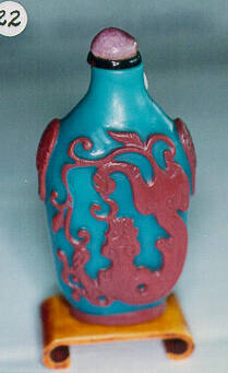 DescriptionFlattened rectangular bottle with sloping shoulders, blue Peking glass with brown overlay and cinnabar red hydra on both sides, animal mask and ring handles on shoulders, brown glass collar and pink tourmaline stopper.