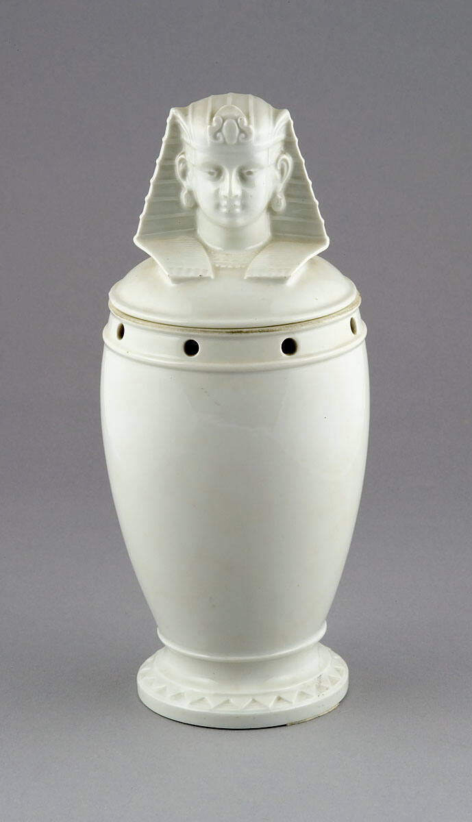 DescriptionColumnar-shaped vessels with circular spreading foot; eight holes at top; circular lid with sphinx head.ProvenancePurchased by Mrs. Sibyl Ellis Renken (1894 -1962) from McMillen Interiors, New York;