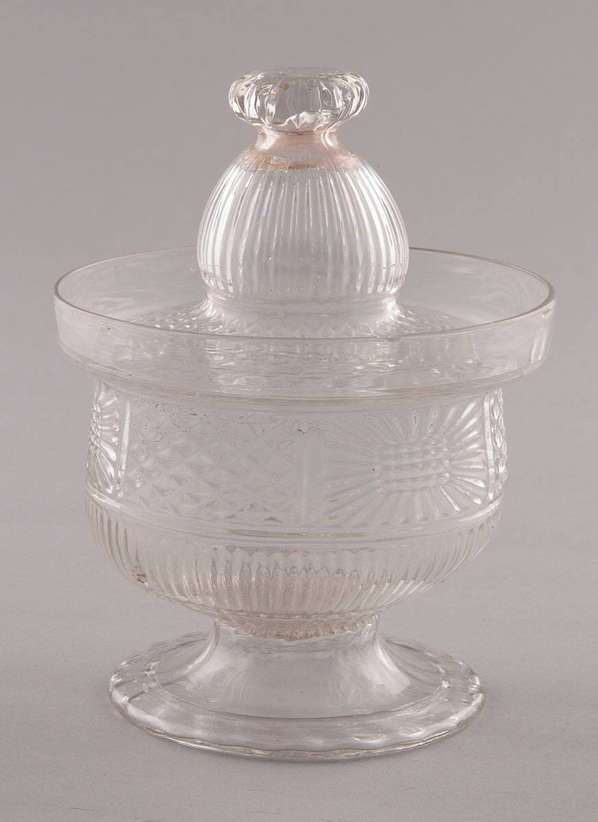 DescriptionBrilliant clear flint glass, straight sided bowl with flaring turned up rim tapering at the bottom to high, graceful applied foot.