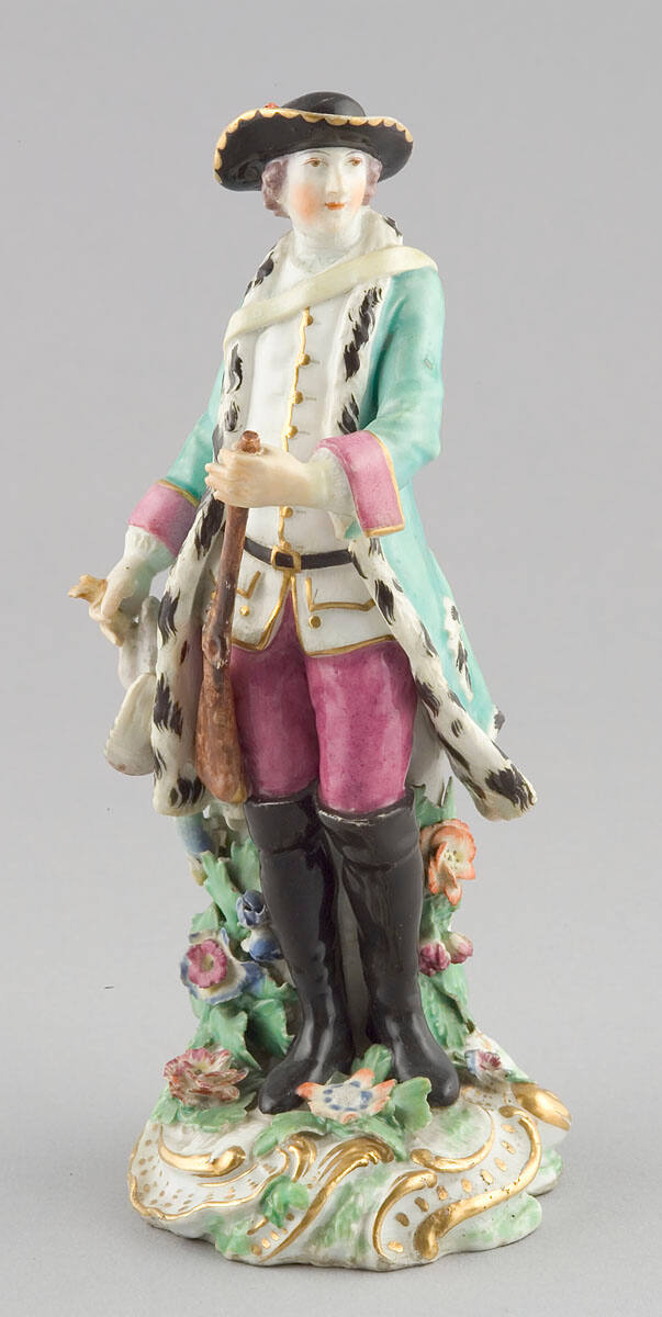 DescriptionA hunter dressed in a long blue coat, white waistcoat, and magent breeches, and wearing high black boots, holds in his right hand a duck and in his left hand a rifle. stump covered with flowers.ProvenanceWith Douglas R. Bird, Silversmith and Antique Dealer, Bath, England, by August 6, 1932;