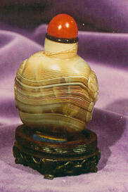 DescriptionBanded lavender agate bottle of flattened ovoid form, carved on each side with faux animal mask, loose ring handles, with a domes cabochon stopper with ivory spoon.