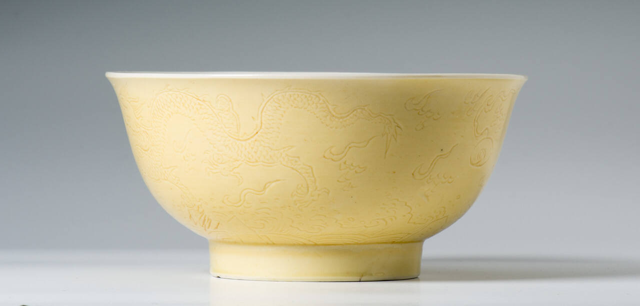DescriptionOne of a pair of bowls glazed white on the interior, pale yellow on the exterior. The exterior is engraved with a design of dragons among clouds, above mountains and waves.