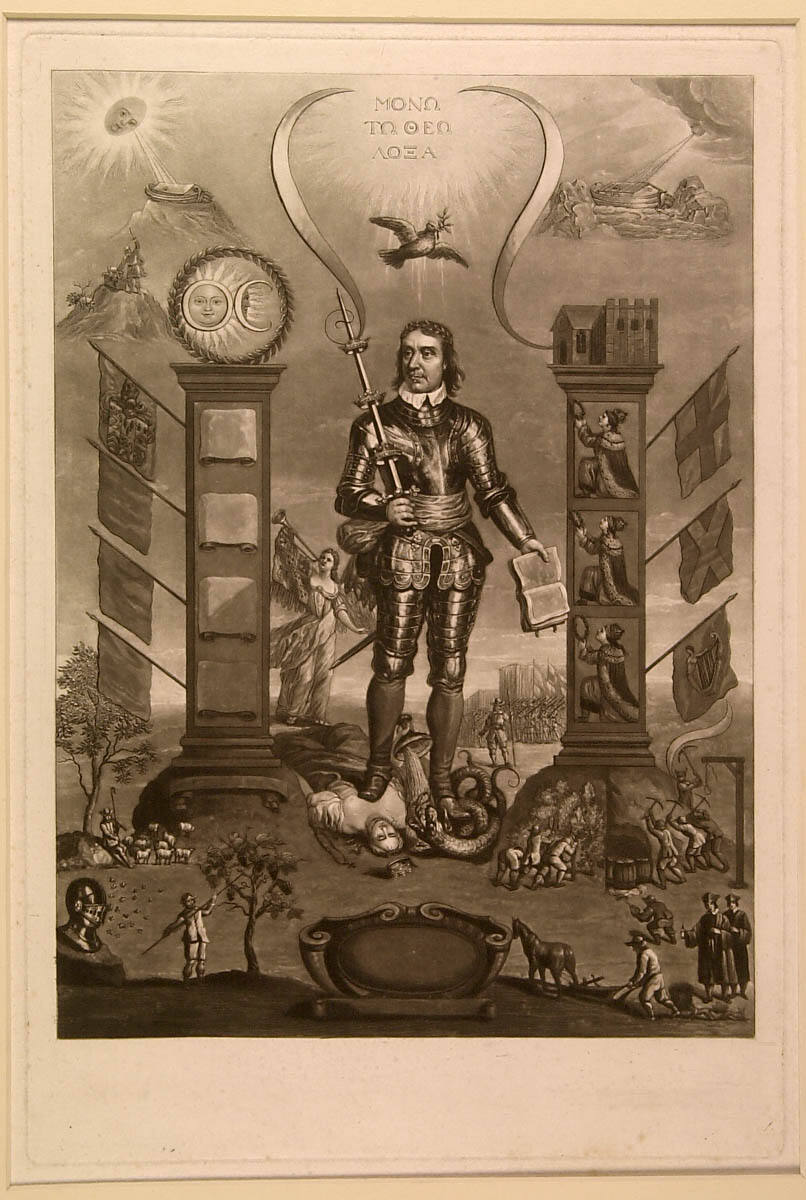 Oliver Cromwell (1599?1658) helped defeat Charles I in the English Civil War of the 1640s and was responsible for the king's execution. Subsequently, he ruled England as a virtual dictator for nearly a decade. Cromwell was an effective head of state, boosting England's status abroad, and was much admired by succeeding generations for his republican, anti-monarchist virtues. Here he is shown trampling on the Whore of Babylon and a serpent, both symbols of vice, accompanied by Fame with a trumpet. Two versions of the print are shown. The first, less detailed version is etched in line. The second, more finished version is worked up to a higher finish in mezzotint, a process in which the original etched line is reinforced by shading.