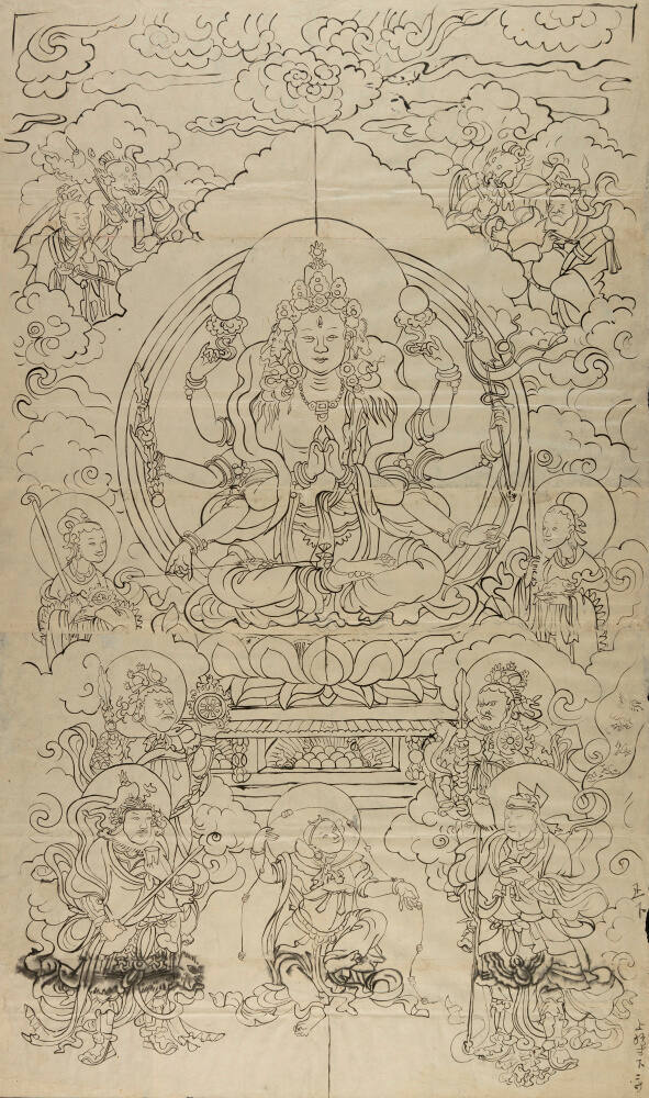 DescriptionEight-armed deity holding various attributes seated on lotus throne, surrounded by guardians and attendants.