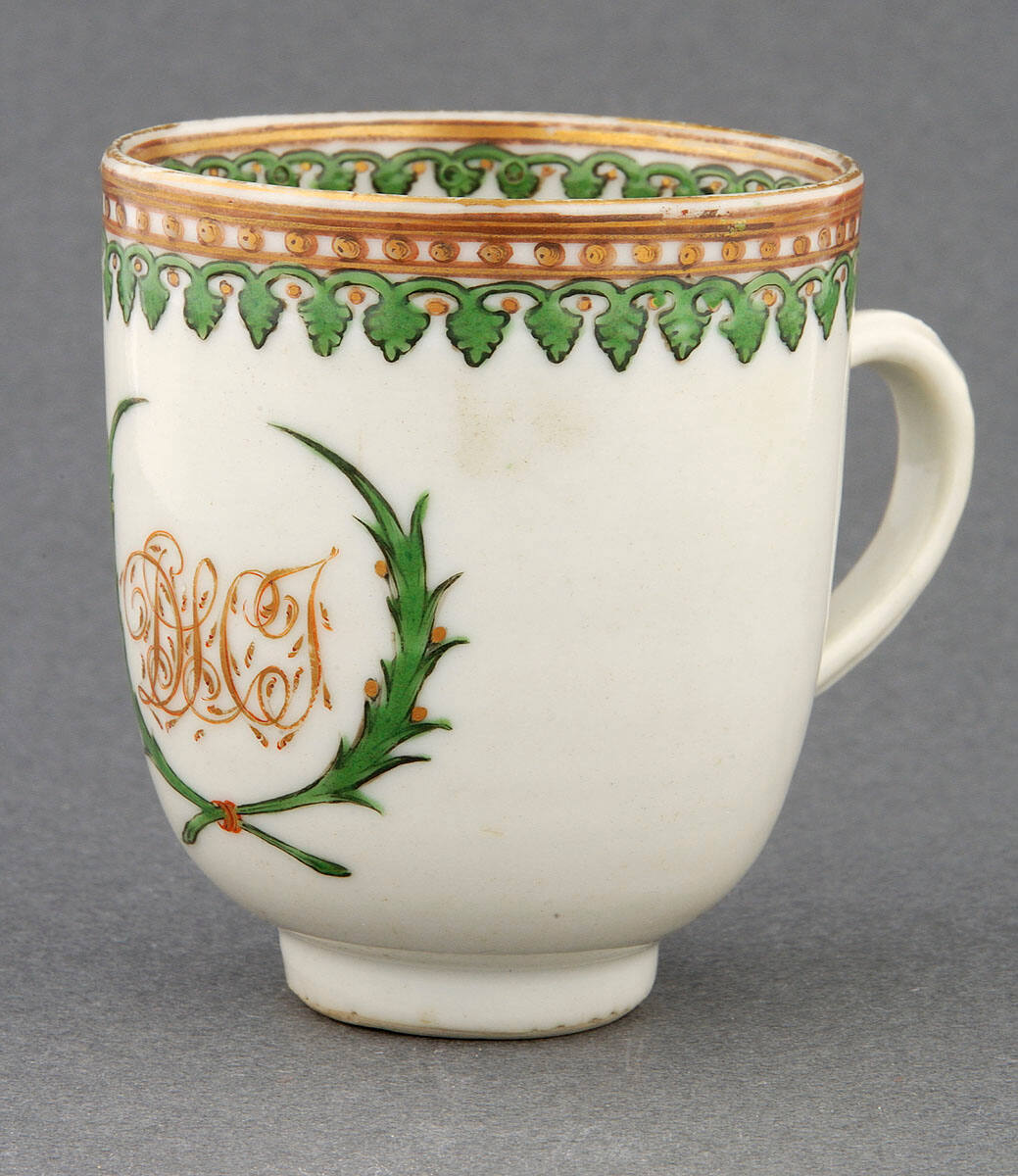 DescriptionSmall cup of white porcelain with handles, decorated on the inside and outside edges with a band of enameled green and gold leaf designs. On the side is a wreath encircling the initials DLCT.ProvenanceMargaret Cameron Chapman (née Mann, 1865-1935), Kansas City, MO, by 1935;