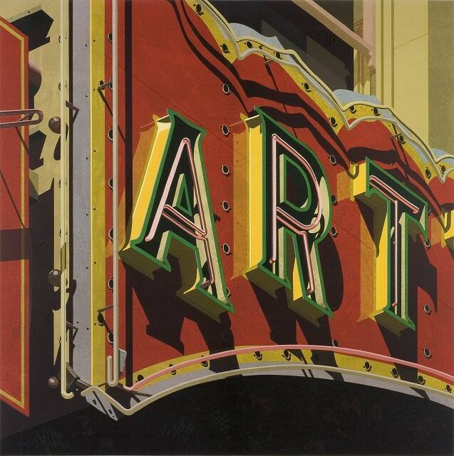 DescriptionClose-up view from left of red marquee with protruding red-tubed letters on black-shaded buff ground, outlined in green, with yellow sides. Marquee, bordered in umber and blue-gray, curved at bottom, scalloped at top. Attached to facade of building, with part of two-light window visible at upper right. At left margin, vertical end portion of another sign in red. Black area at bottom.Gallery LabelKnown for his paintings of neon signs, Robert Cottingham combines abstraction and illusionism to create striking large-scale paintings and prints. In this lithograph, Cottingham draws our attention to the single word "art" by removing it from its association with other words in the title on the theater marquee. Is he hinting that art is a thing of the past, something once grand but now just a nostalgic afterglow? Or is he more interested in the combined abstract effect of the forms, colors, curved lines and angles in the image?