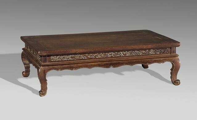 DescriptionA jichimu rectangular kang table with a three-board (?) flush floating panel top and typical mitred, mortise and tenon frame with two transverse stretchers with their tenons exposed in the long rails of the frame. The outside edge of the frame is square with a quarter circle below and a square shoulder beneath that. The deep waist with square posts to each corner is made of a single panel to each side deeply carved with a design of birds and flowers within a raised beaded edge with re-entrant corners. Beneath the waist is a flattened almost pointed molding with a strongly cusped apron, mitred and half-lapped into the short cabriole legs which terminate in an upward turning scroll foot. There is a raised beaded edge to both the apron and leg. Probably late Ming.