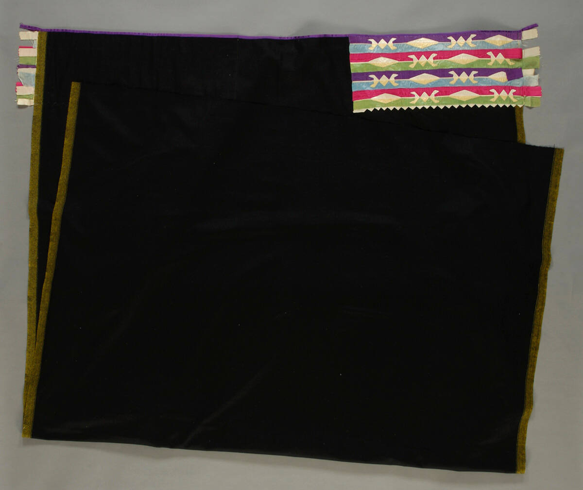DescriptionSkirt with decoration of cut ribbonwork appliqué in geometric motifs, a sawtooth edge at the top. Ribbonwork in white, yellow, green, purples and blue; some fading.