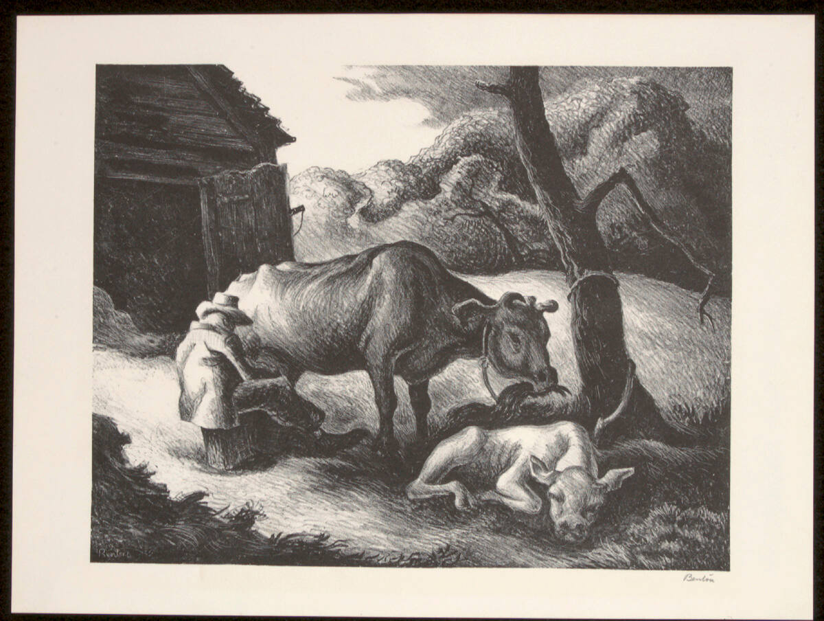 DescriptionA man sits on a stool and milks a cow which eats grass and is tied to a tree. Next to her is a white calf. To the left is a barn.ProvenanceCopyright© Thomas Hart Benton and Rita P. Benton Testamentary Trusts / Licensed by VAGA at Artists Rights Society (ARS), New York