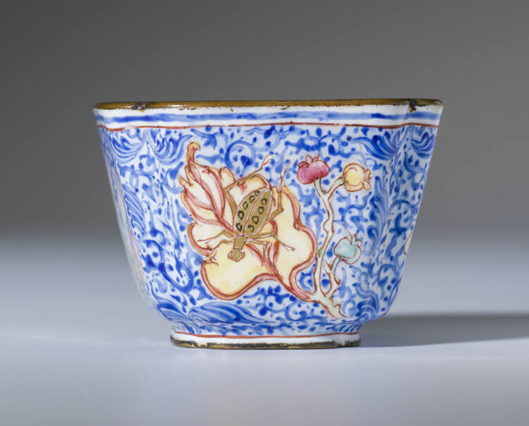 DescriptionChien Lung Canton square wine cup, part of a set of six wine cups and saucers, decorated with conventional flower, fruit, and insect designs, with a blue scroll pattern in the background.